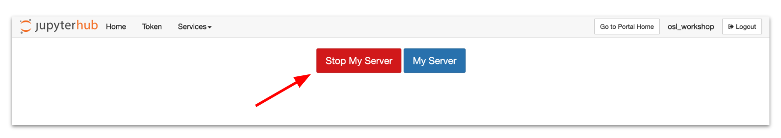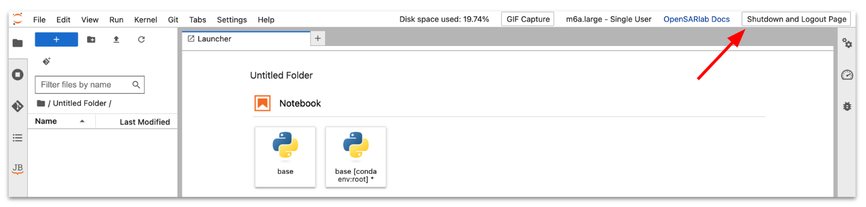 Click the Shutdown and Logout Page button at the top right of the JupyterLab desktop